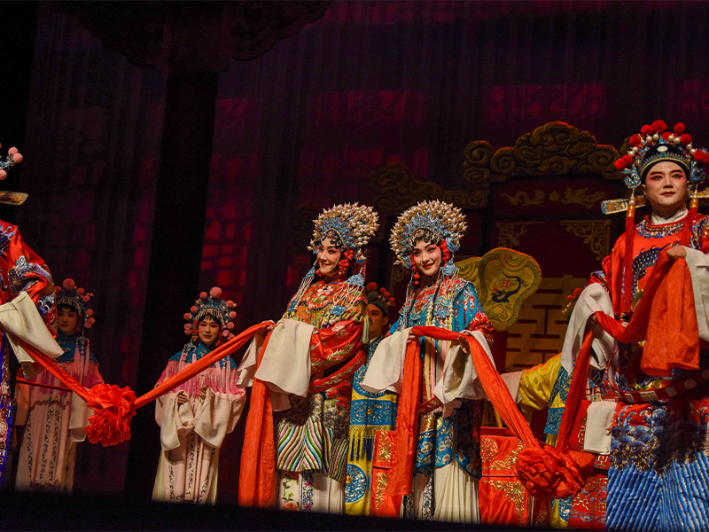 悠揚動聽的曲調(diào)響起,帶領(lǐng)觀眾回味膾炙人口的故事:馮素珍自幼許配李兆廷,李氏家道敗落后,馮家父母嫌棄李兆廷,誣陷他入獄,并逼馮素珍另嫁富室。馮素珍女扮男裝,冒李兆廷之名應(yīng)試,竟考中狀元,并被招為駙馬。洞房花燭夜,馮素珍冒死陳詞感動公主。第二天,金鑾殿上,馮素珍以才智令皇帝赦免她欺君之罪,釋放李兆廷出獄。馮素珍之兄馮益民本是前科狀元,面圣為妹請罪,與公主邂逅于金鑾殿,二人一見鐘情,大臣劉文舉作媒將馮益民招為駙馬,兩對有情人同結(jié)百年之好。