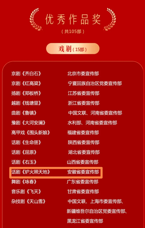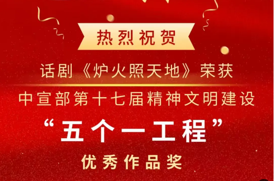 12月3日,中共中央宣傳部印發(fā)表彰決定,對第十七屆精神文明建設(shè)“五個(gè)一工程”組織工作先進(jìn)單位和優(yōu)秀作品進(jìn)行表彰。授予話劇《爐火照天地》等105部作品“優(yōu)秀作品獎(jiǎng)”,授予安徽等15個(gè)省區(qū)市黨委宣傳部“組織工作獎(jiǎng)”。